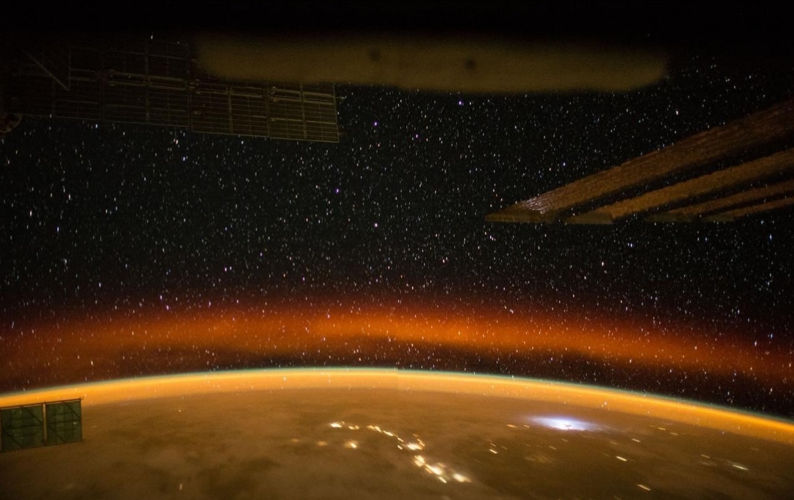 A mesmerizing golden glow blankets Earth, accompanied by a vivid red aurora, glimpses of lighting through the clouds, and the twinkle of city lights. This long-exposure photo was taken aboard the @ISS by the Expedition 43 crew on April 18, 2015.